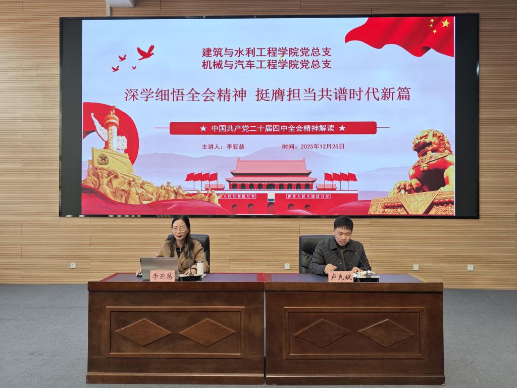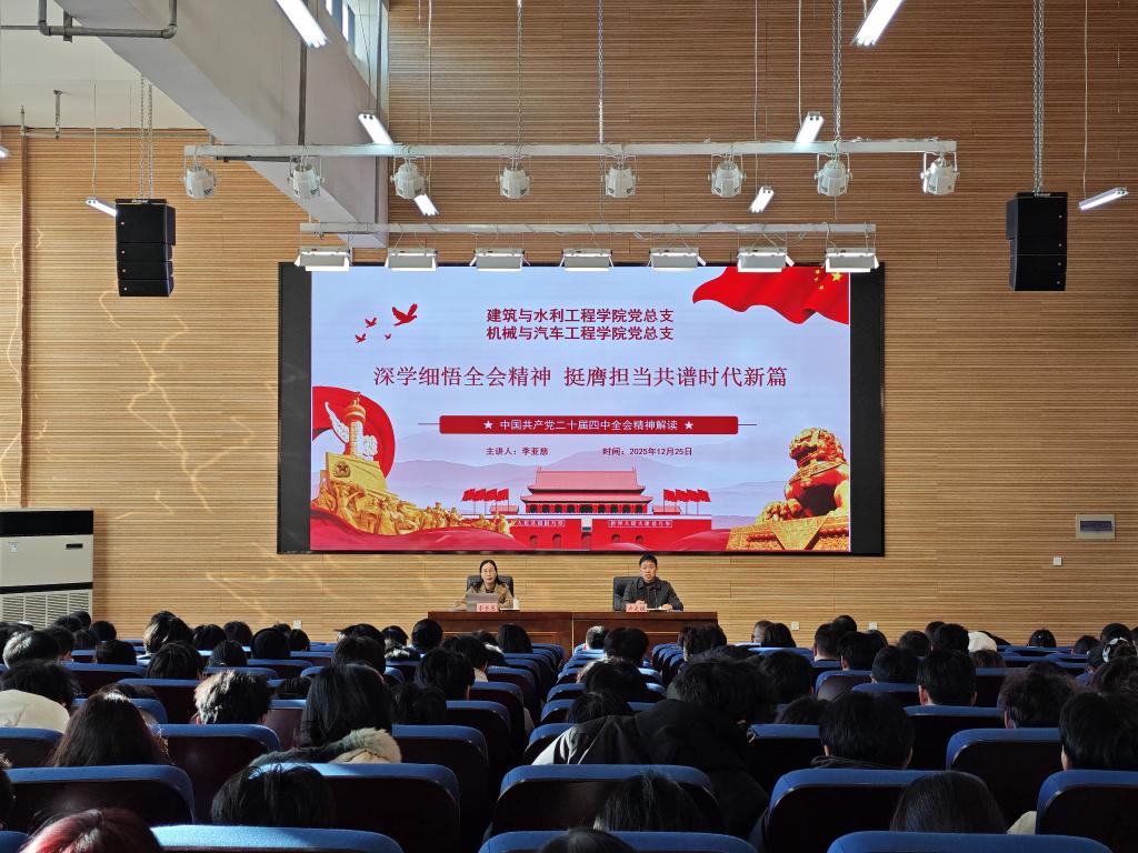 为学习宣传贯彻好党的二十届四中全会精神,12月25日,建筑与水利工程学院和机械与汽车工程学院在5137学术报告厅联合举办党的二十届四中全会精神集中宣讲。学院思政教师宣讲团成员李亚慈副教授应邀作专题报告,建筑与水利工程学院和机械与汽车工程学院师生党员参加此次活动,活动由建筑与水利工程学院副书记卢克斌主持。
