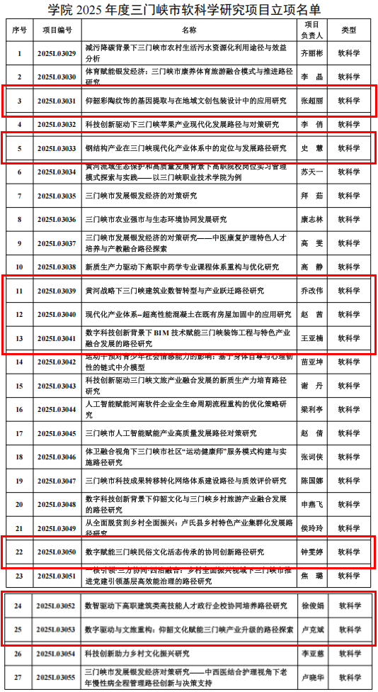 近日,三门峡市科学技术局正式下发《关于下达三门峡市二〇二五年科技发展计划的通知》(三科字〔2026〕5号),公布了2025年度市级科技计划项目立项结果。建筑与水利工程学院再创佳绩,8项课题成功获批立项(全校共立项38项),占比达21%。这一成绩标志着我院在深化“产教融合、科教融汇”、推进“双高”建设进程中迈出了坚实步伐,科研服务能力与学科建设水平持续提升。
