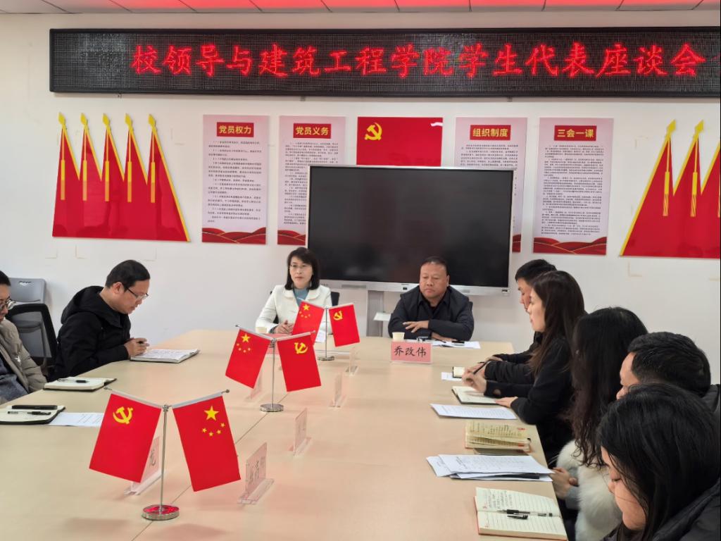 张雪冰在讲话中首先代表学校纪委向辛勤工作的老师们表示感谢,向勤学善思的学生代表们致以问候。她高度肯定了建筑工程学院在专业建设、师资队伍和人才培养等方面取得的显著成绩,特别是近年来在国家级技能大赛中屡创佳绩。她强调本次座谈会旨在搭建沟通桥梁,倾听学生心声。同时,对同学们提出三点希望:一要坚定理想信念,做好人生规划;二要夯实专业基础,锤炼过硬本领;三要拓宽知识视野,实现全面发展。要求学院干部要深入学习贯彻党的二十届四中全会精神,践行育人使命,以务实作风推动学院发展,在全校争当先锋。