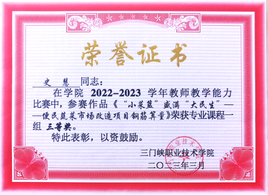 近日,三门峡职业技术学院2022-2023学年教师教学能力大赛决赛在天鹅湖校区圆满完成,经过专家组的严格评审,建筑工程学院林琳老师团队的《建筑装饰工程空间设计》课程项目荣获专业课程一组一等奖,史慧老师团队的《平法识图与钢筋算量》课程项目荣获专业课程一组三等奖。