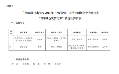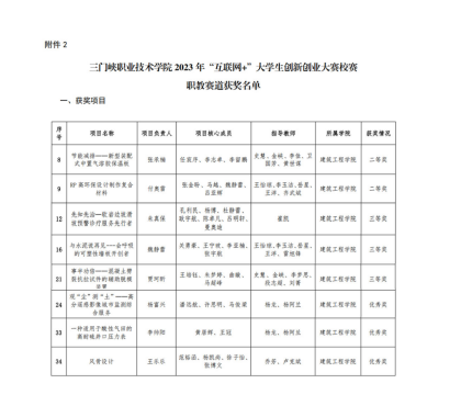 2023年6月,9支队伍经过建筑工程学院培训、选拔参加了。2023年“互联网+”大学生创新创业大赛校赛,并获得1个一等奖、3个二等奖,4个三等奖和1个优秀奖的好成绩。