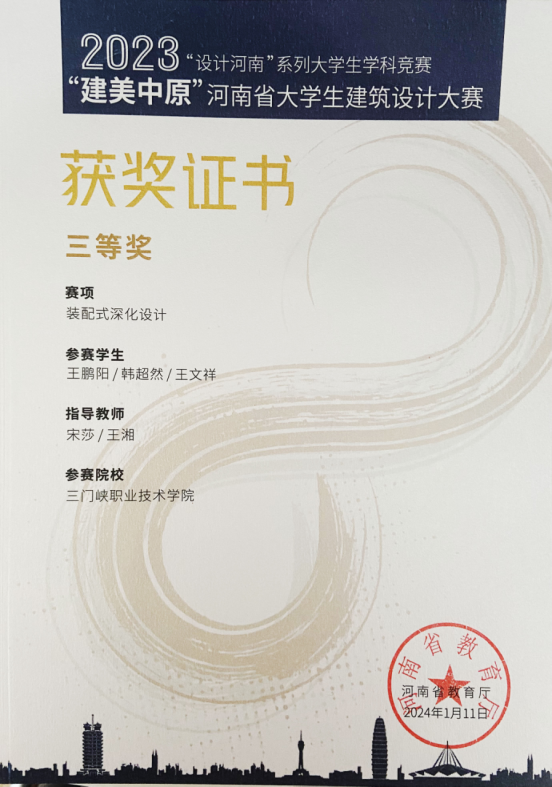2024年1月,河南省教育厅公布了《2023“设计河南”系列大学生学科竞赛获奖名单的通知》(教高〔2024〕19号),建筑工程学院喜获两个赛项的荣誉。