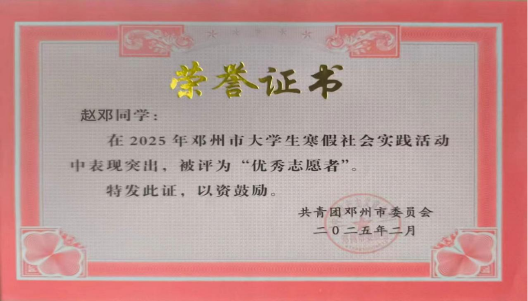 思想上,赵邓积极向党组织靠拢,入学不久便提交入党申请书,坚持通过学习强国等平台学习党的理论政策。他积极参加志愿服务,无论是协助社区开展老旧房屋安全排查,还是参与建筑环保宣传,都乐此不疲,用实际行动践行初心。他注重全面发展,以党员标准严格要求自己,提升政治觉悟与业务能力,期待早日成为党组织的一员,为中国梦贡献力量。